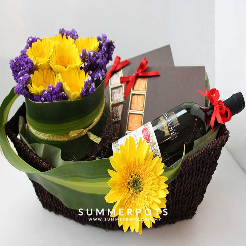 7 Gerberas, 2 Godiva Chocolates & 1 Btl Red Wine