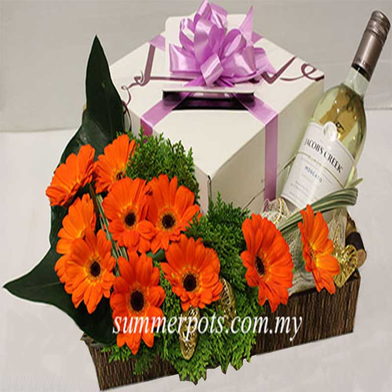 10 Orange Gerberas, 1 Btl White Wine & 1/2 kg Chocolate Cake