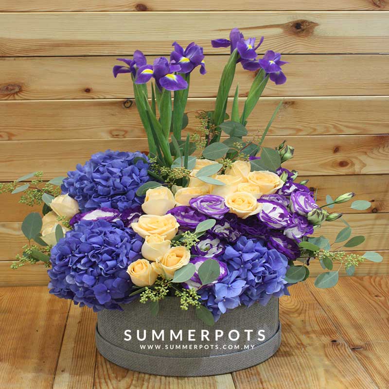 5 Iris Flowers, 3 Dark Blue Hydrangeas, 20 Champagne Roses & Two Tone Purple Eustoma