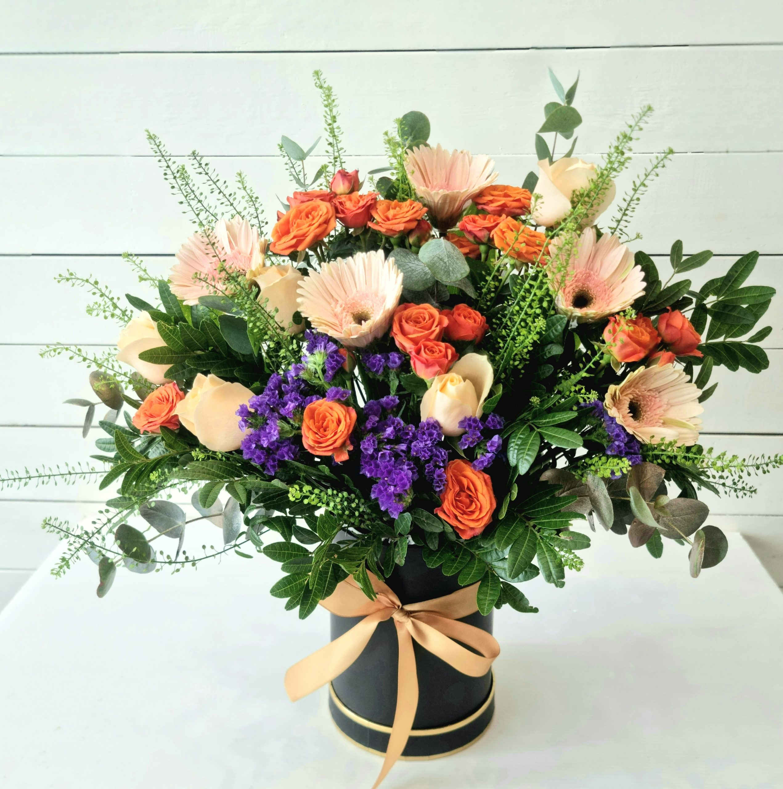 5 Champagne Roses, 5 Pink Gerberas, Spray Orange Roses & Dark Purple Statice