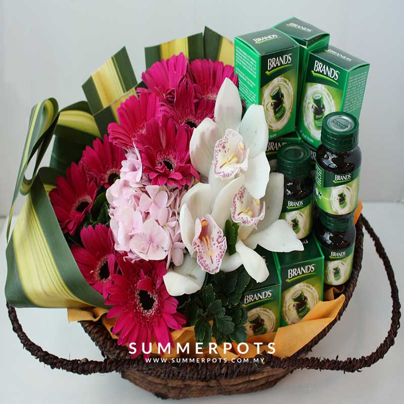 10 Shocking Pink Gerberas, 3 White Cymbidium and Pink Hydrangea with 12 Brand’s Essence of Chicken
