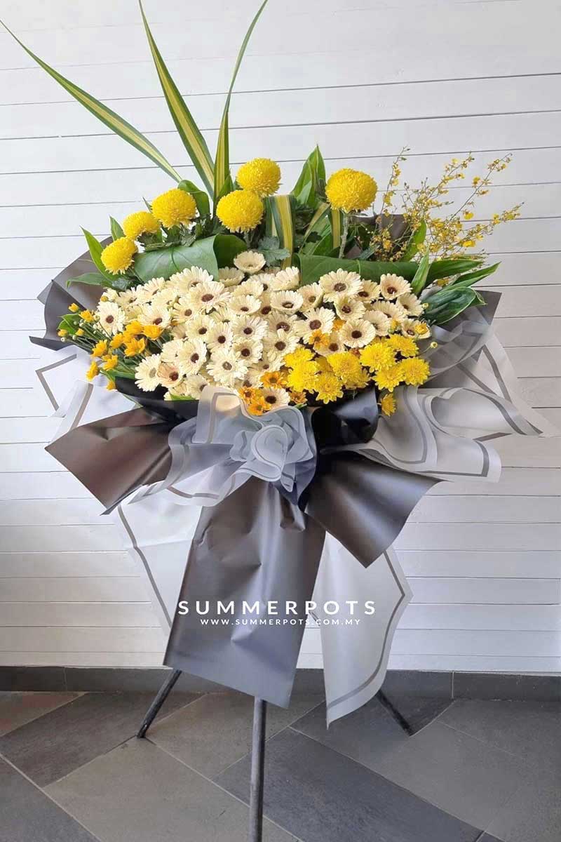 6 Yellow mum, 60 Geberas, Dancing Lady & Yellow Pompom.