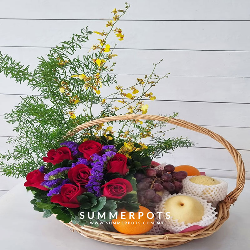 7 Red Roses, 2 Dancing Lady and Statice with assorted fruits