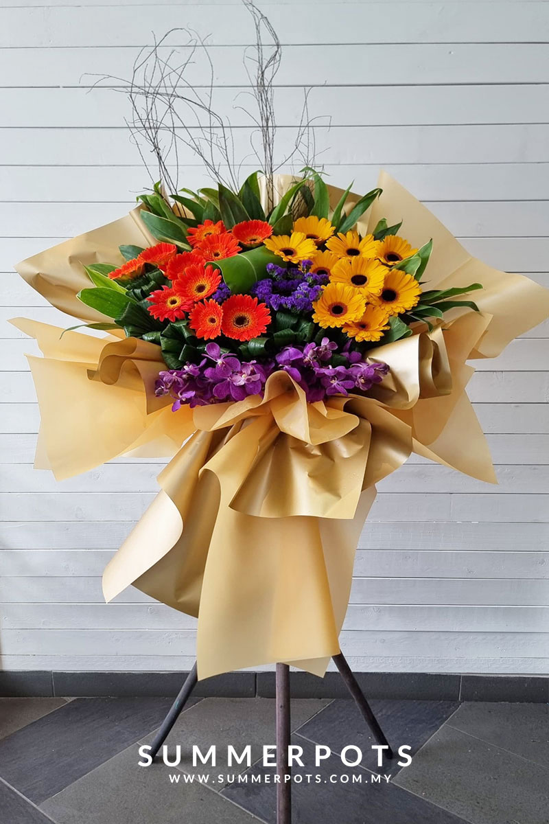 10 Orange Gerberas, 10 Gold Yellow Gerberas, 5 Purple Orchids & Dark Purple Statice.
