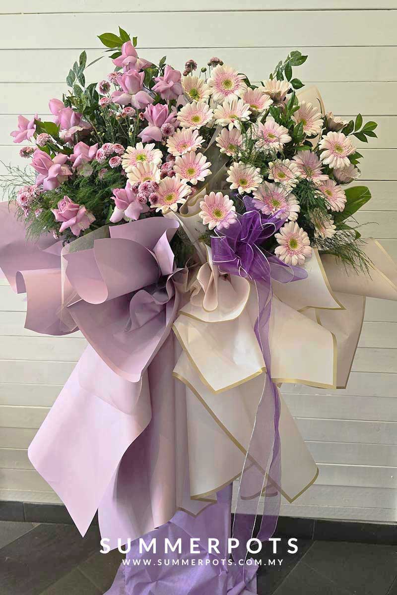 30 Light Pink Gerberas, 10 Purple Roses & Mini Purple Pom Pom Calimeros