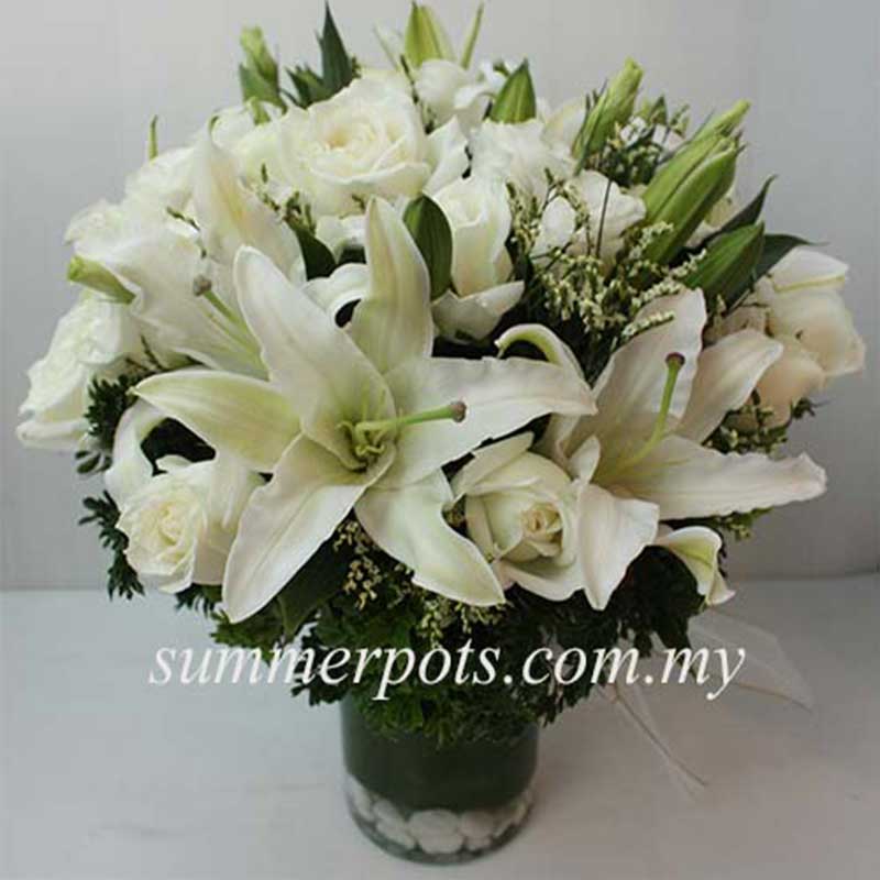 5Stks White Lilies, 10 White Roses and 10 White Eustoma in Glass Vase